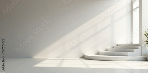 Minimalist White Room Interior Design with Sunlight and Curved Staircase Platform