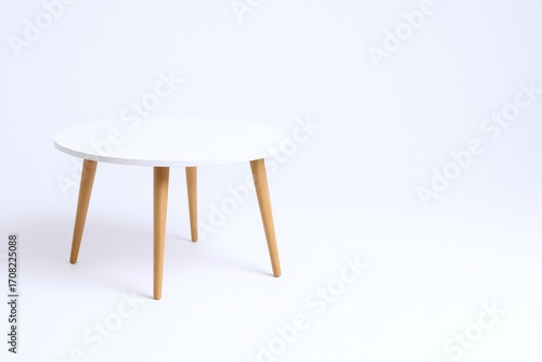 Minimalist White Round Table with Wooden Legs Isolated on White Background, Modern Furniture Design