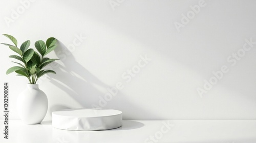 Minimalist White Studio Scene with Greenery and Display Platform for Product Presentation