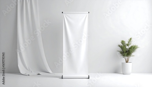 Minimalist White Studio with Blank Roll-Up Banner and Potted Plant