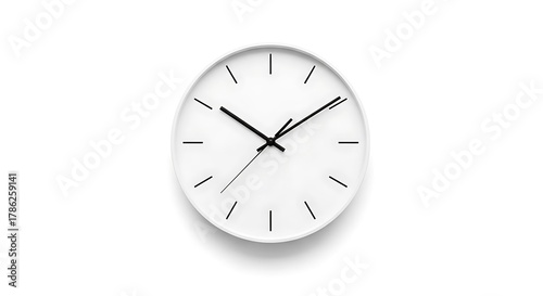 Minimalist white wall clock with black hour minute and second hands against a clean white background
