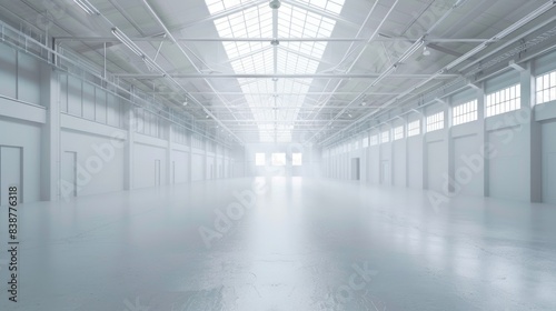 Minimalist white warehouse interior with an expansive, empty space and a pure white background, ideal for various setups