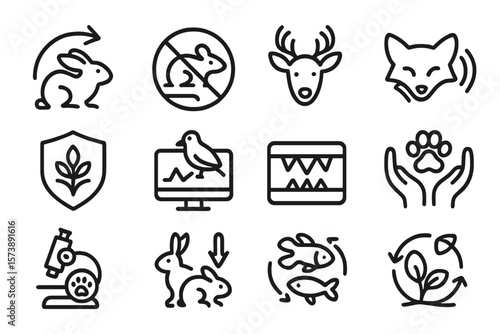 Minimalist wildlife and conservation icons with nature and animal protection elements