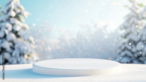 Minimalist winter podium surrounded by snow-covered trees under a clear blue sky, creating a frosty and peaceful scene.