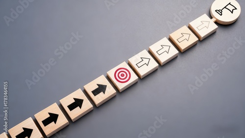 Minimalist Wooden Blocks with Arrow Pointing to Financial Growth Path, Symbolizing Development and Goal Background for Business and Education Concepts.