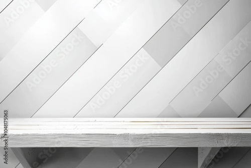 Minimalist wooden shelf against a stylish white paneled background.