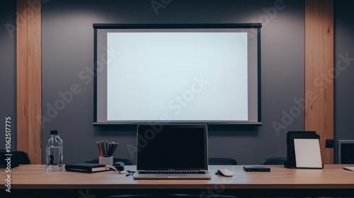 Minimalist Workspace Featuring a Blank White Projector Screen and Laptop Setup