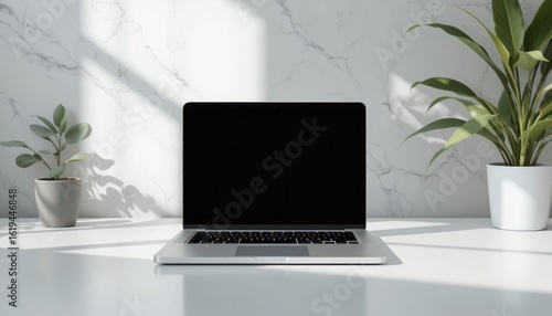 Minimalist Workspace: Laptop Plants and Marble Wall with Soft Sunlight Shadows.
