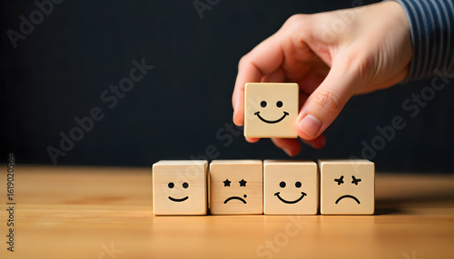 Minimalist Workspace Setting with Hand Holding a Smiling Face Wooden Block for Positive Feedback or Customer Satisfaction