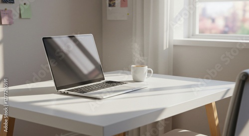 Minimalist workspace with a clean desk, laptop, and a cup of coffee