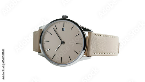Minimalist Wristwatch with Beige Leather Strap on Transparent Background