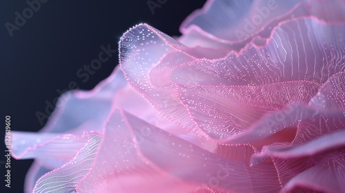 Minimalist X-ray close-up of translucent peony petals, dark silk backdrop, dramatic backlighting, glowing effect, enhancing softness, dramatic and voluminous.