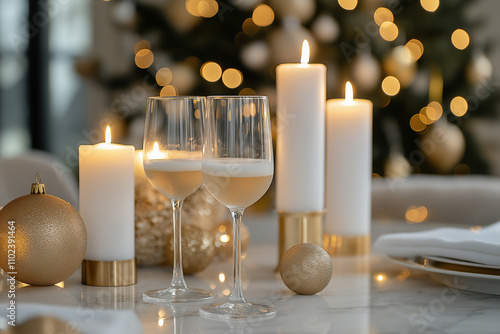 Minimalistic arrangement of champagne glasses beside lit candles and decorative ornaments on a table