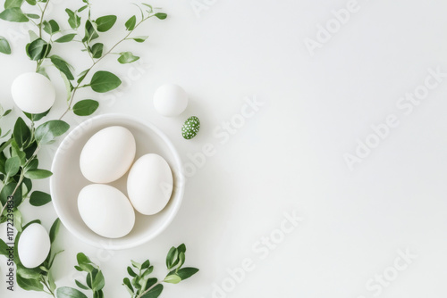 Minimalistic Arrangement of White Eggs With Greenery on a Neutral Background for Spring Decor