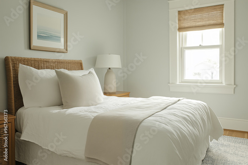 minimalistic bedroom with wicker bed frame and soft natural light