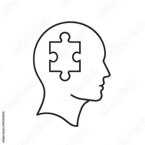 Minimalistic black-and-white line art illustration of a human head with a puzzle piece, concept of problem solving and mental processes, modern design