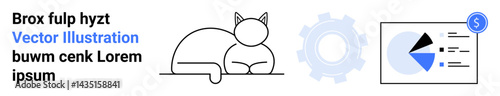Minimalistic cat outline, gear icon, and analytics graph panel with dollar sign. Ideal for technology, finance, web design, business strategy, education, creativity simple landing page