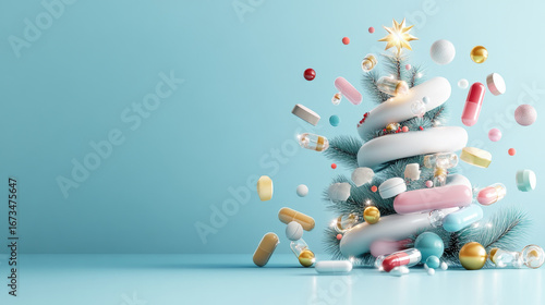 Minimalistic Christmas tree decorated with colorful medical capsules on a light blue background, festive holiday concept for healthcare, innovative Christmas medical banner with copy space