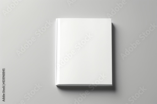 Minimalistic image of a closed, blank white book on a plain gray background with a soft shadow