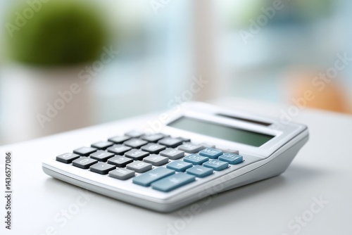 minimalistic image of silver-colored calculator on neat empty desk surface with abundant copy space