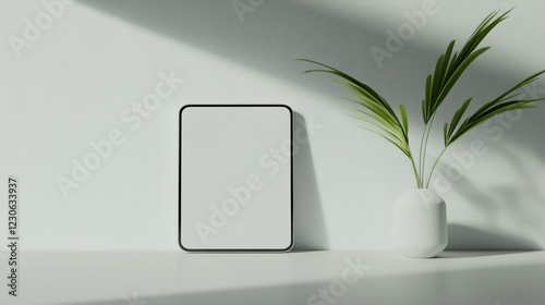 Minimalistic interior design with blank frame and vase with green leaves
