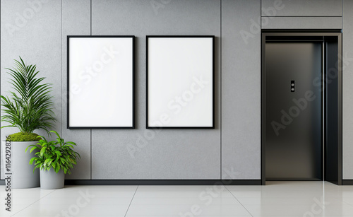 Minimalistic interior with two blank picture frames, a potted plant, and an elevator door on a clean, modern wall.