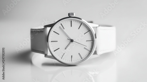 Minimalistic isolated shot of a modern, minimalist wristwatch placed on a white surface. Great for promoting fashion accessories.