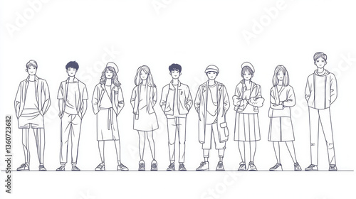 Minimalistic line art illustrating a diverse group of individuals standing together, reflecting various fashion choices and styles, promoting inclusivity and self-expression.