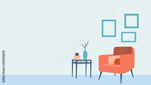 Minimalistic living room interior illustration. Armchair with cushions and coffee table
