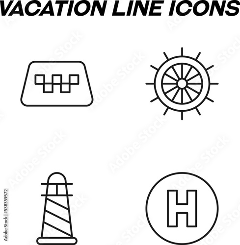 Minimalistic outline signs drawn in flat style. Editable stroke. Vector line icon set with symbols of taxi, helm, steering wheel, lighthouse, hotel