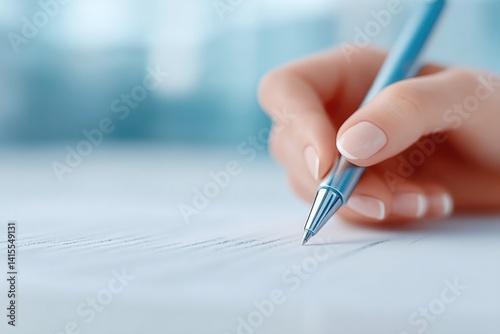minimalistic portrait of person holding pen over contract or form sitting at desk with blurred background and ample