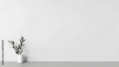 Minimalistic setting with a white vase holding green leaves against a clean backdrop
