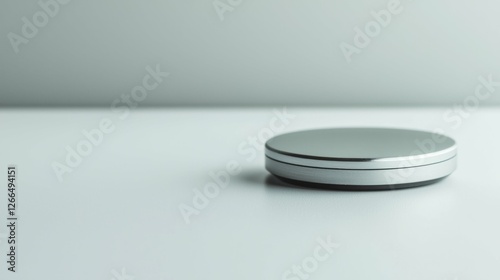 Minimalistic Silver Round Object on a White Surface with Soft Light