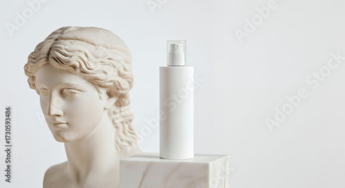 Minimalistic skincare bottle displayed next to a classical sculpture on a light background