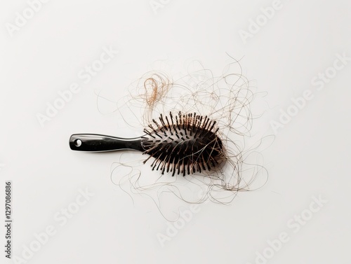 Minimalistic studio shot of a hairbrush with a noticeable clump of fallen, brittle hair.