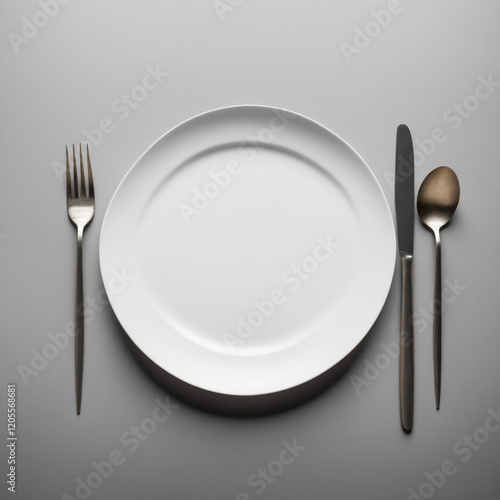 Minimalistic Table Setting with Plate, Fork, and Knife on Gray Background