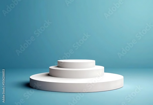 Minimalistic three-tiered white podium with a light blue backdrop scene