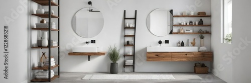 Minimalistic white bathroom with black accents and wooden shelving, contemporary., clean, chic