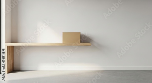 Minimalistic wooden shelf with a cardboard box in bright room