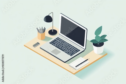 Minimalistic workspace with laptop, plant, and office supplies in pastel colors