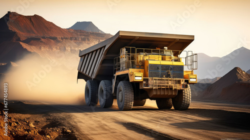 Mining truck for coal extraction moving along dusty quarry road at open pit mine industry