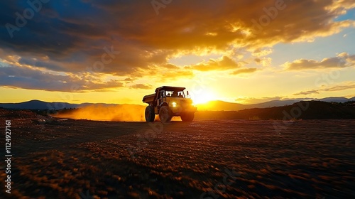 Mining Truck Working in Quarry Under Golden Evening Sky