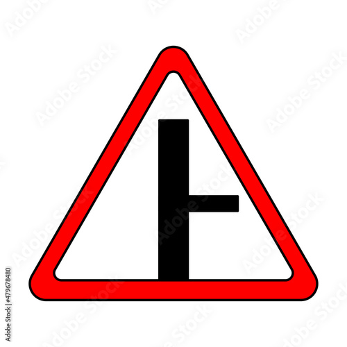 Minor cross road from right. Information road sign. Red triangle icon. Traffic element. Vector illustration. Stock image.