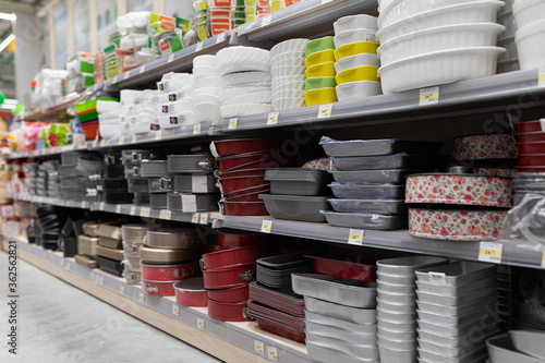 MINSK, BELARUS - April 01, 2020: large selection of cookware on store shelves