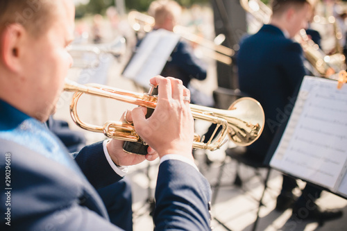 Minsk, Belarus - September 15, 2019: Musical instrument - copper tube with pump action - selective focus