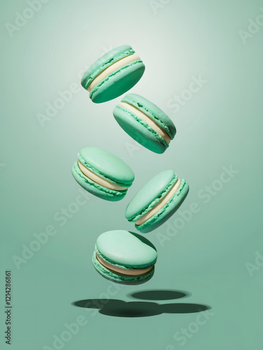Mint green macarons: A vibrant scene of pale mint green macarons, a popular French dessert, suspended gracefully in mid-air against a soft, gradient mint green background