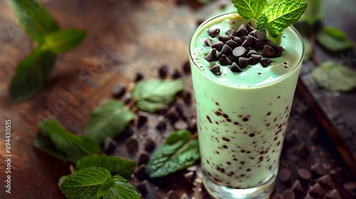 Mint smoothie poured into a tall glass decorated