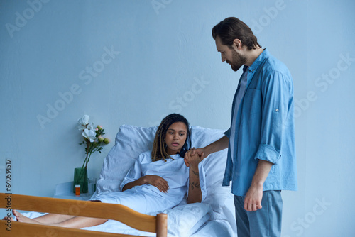 miscarriage, man holding hand of sad african american wife, grief, hospital bed, private ward