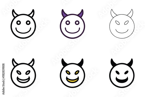 Mischievous devil smiley face emoji illustrations, minimalistic line art icons with variations in color and expressions, line art icon set