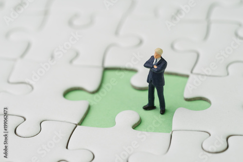 Missing key person for business success strategy concept, miniature people businessman standing at the missing white jigsaw puzzle piece on pastel green background